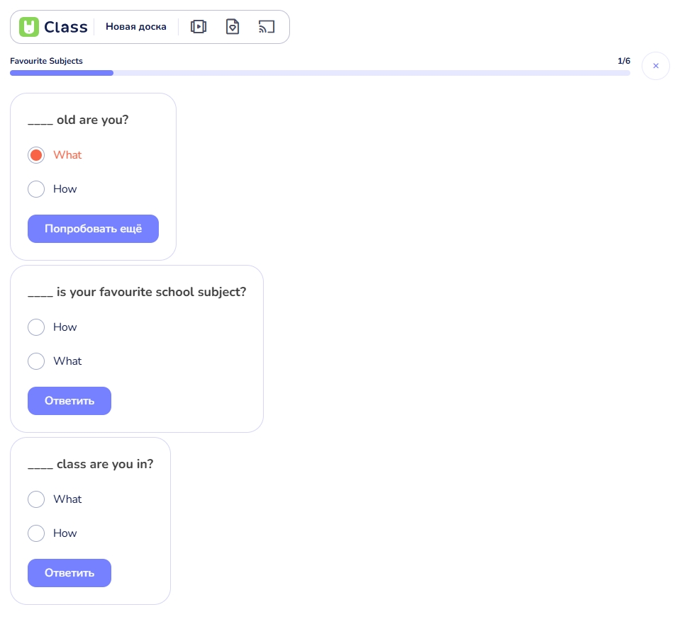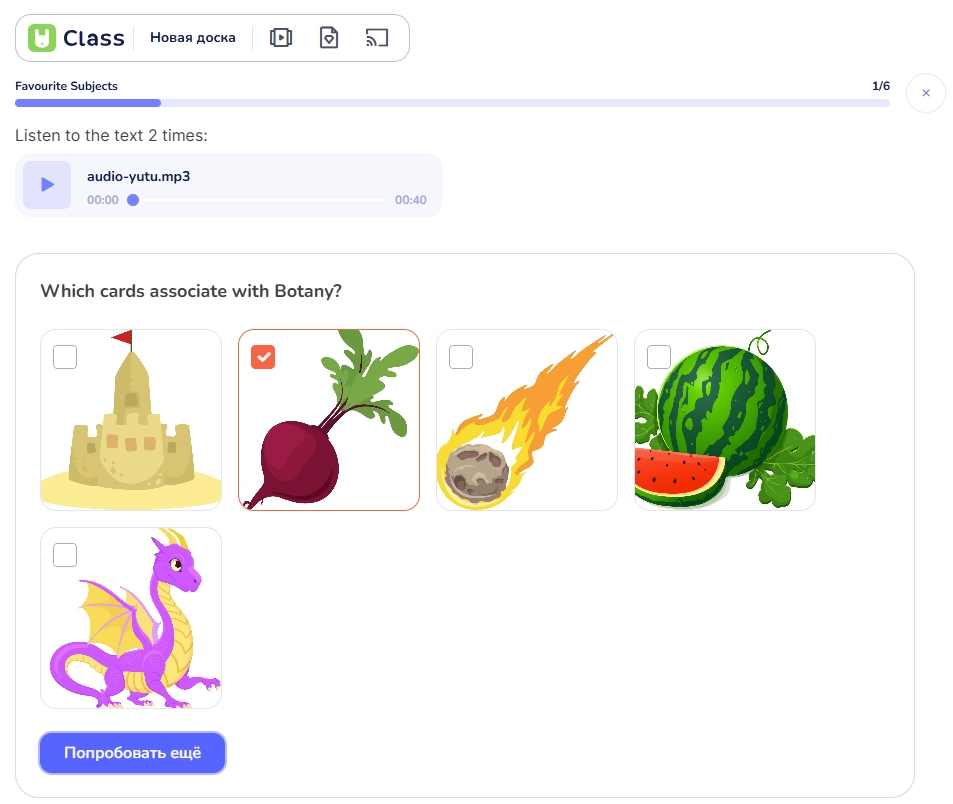 После нажатия кнопки “Попробовать еще” пользователь сможет повторно выбрать ответы и подтвердить выбор нажатием кнопки “Ответить”.