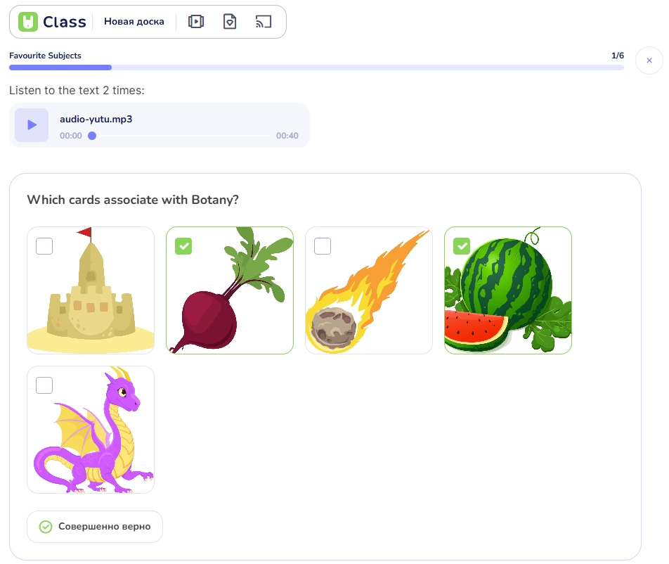 Если ответ верный, он подсвечивается зеленым цветом с надписью “Совершенно верно”.