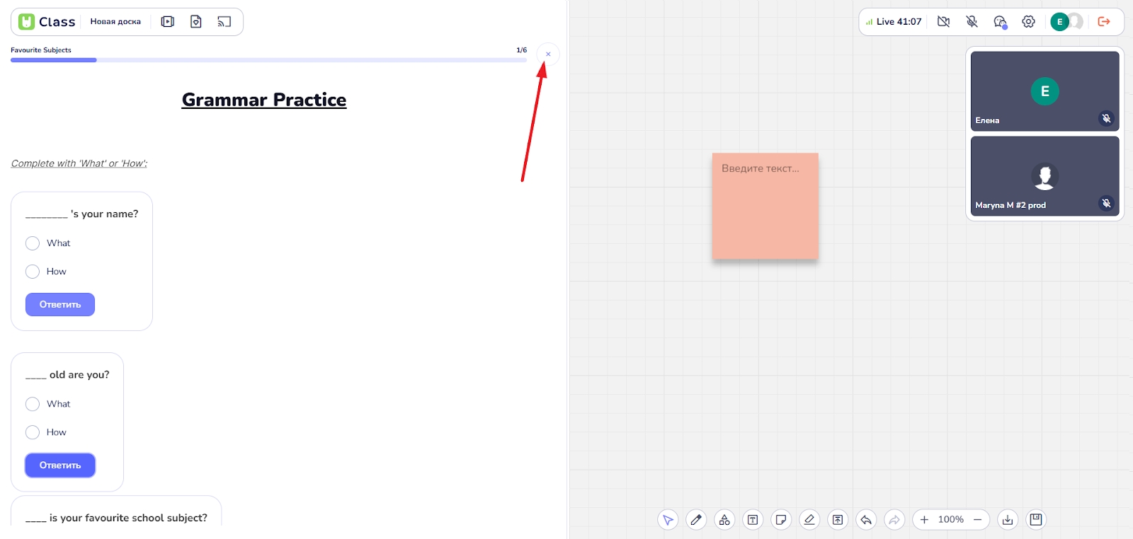 По завершении работы с пособием преподаватель нажимает кнопку “Крестик” в правом верхнем углу окна пособия. После этого пособие закрывается, и пользователи остаются на интерактивной доске.