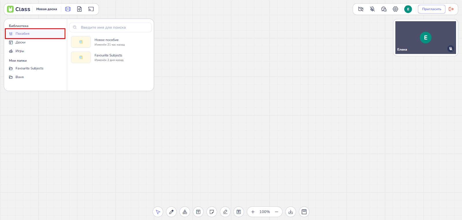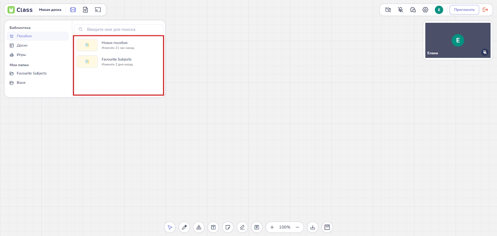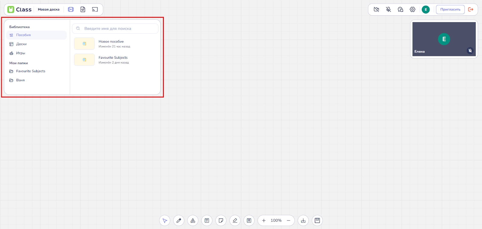 В верхней левой части окна открывается Библиотека материалов. Здесь преподаватель может выбрать, какие материалы загрузить на доску. Это могут быть доски, пособия или игры.