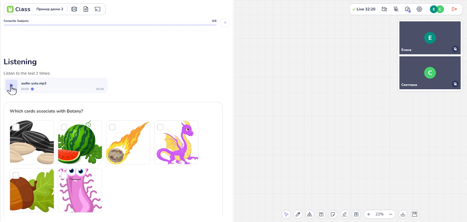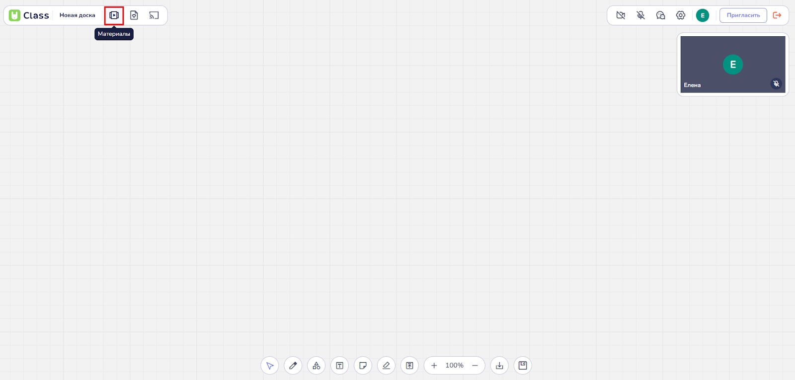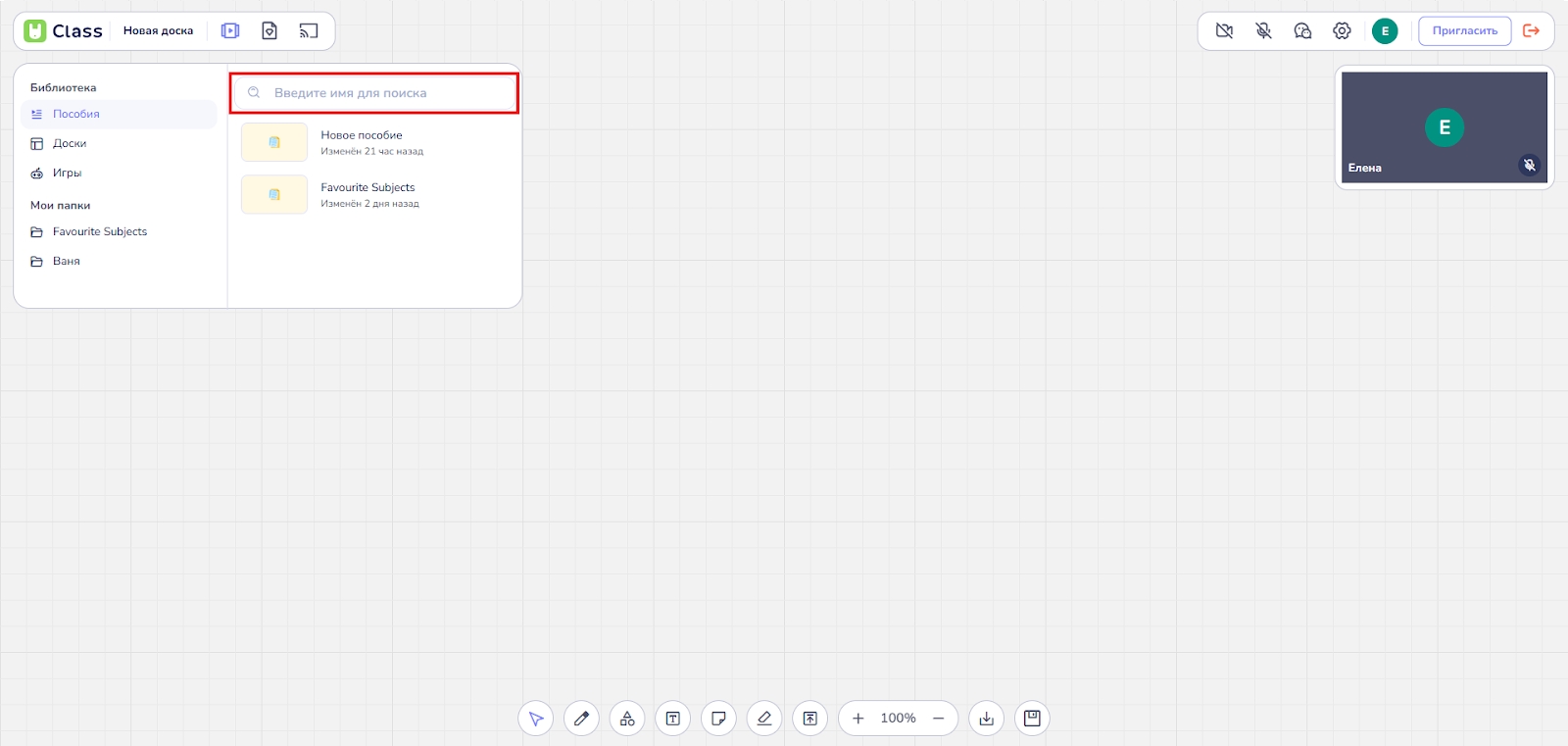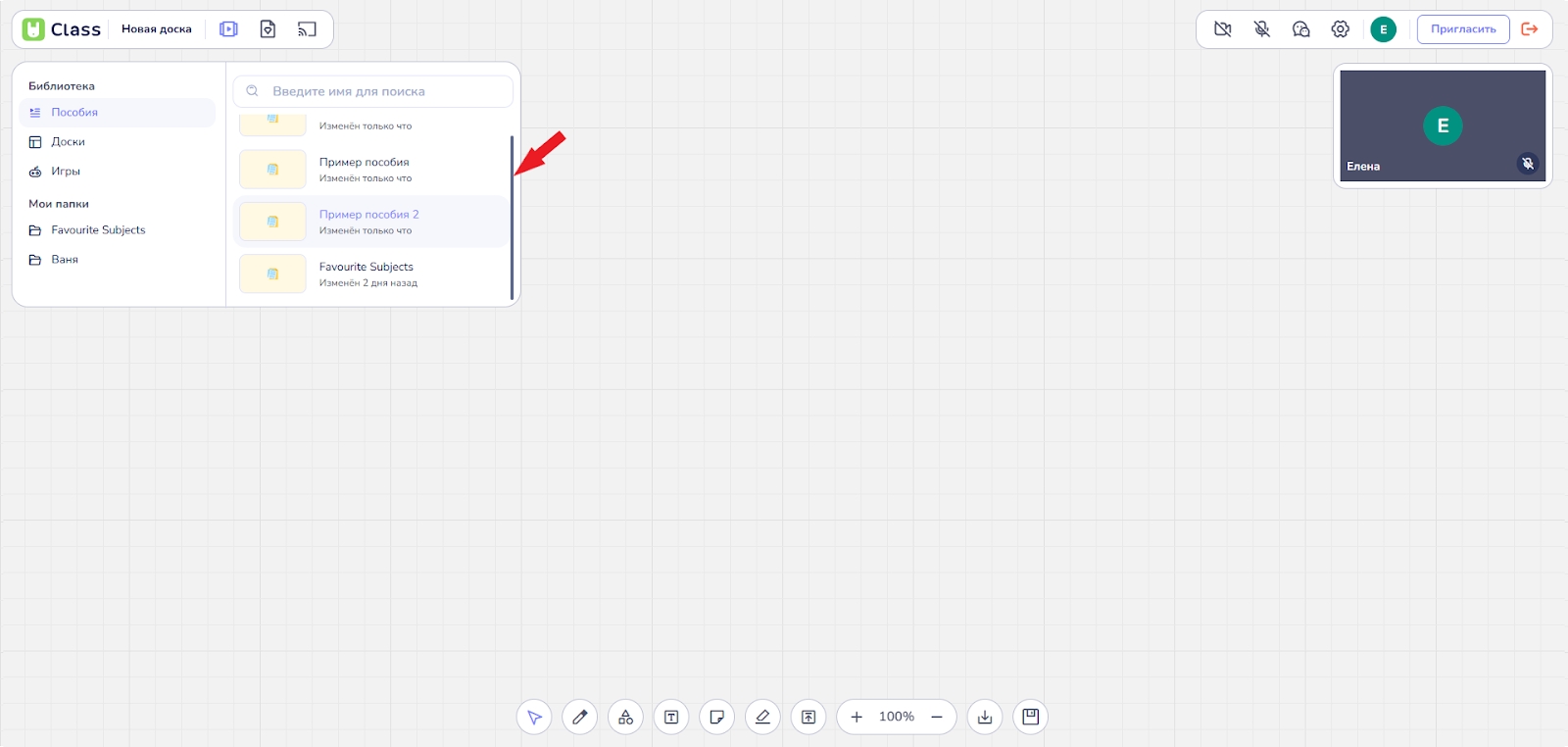 В верхней левой части окна открывается Библиотека материалов. Здесь преподаватель может выбрать, какие материалы загрузить на доску. Это могут быть доски, пособия или игры.