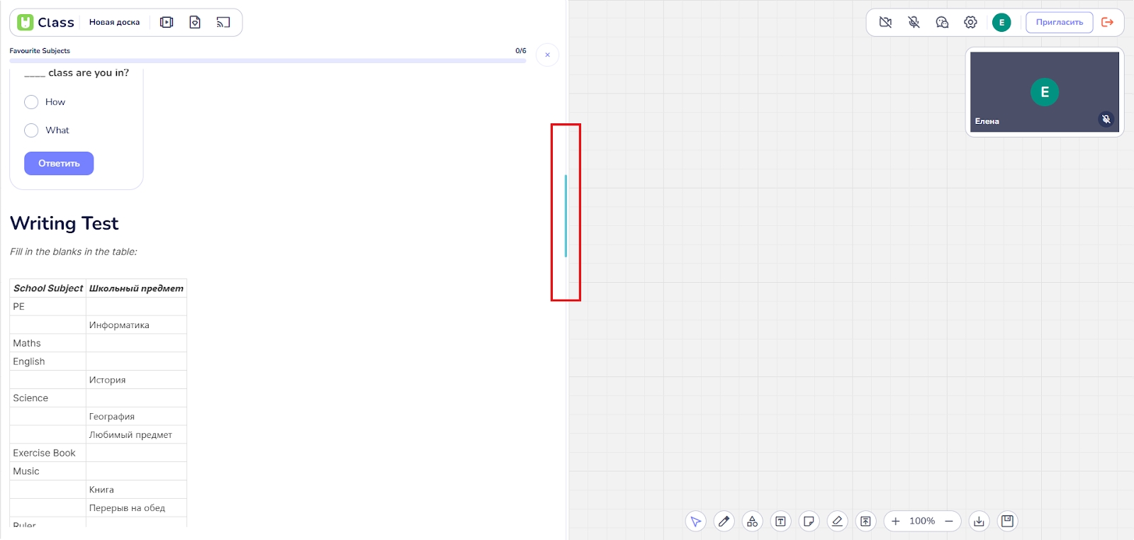 При нажатии левой кнопкой мыши на выбранное пособие оно будет запущено. Пособие откроется в отдельном поле слева от доски и займет примерно ½ или ⅓ экрана, в зависимости от содержимого доски и разрешения экрана пользователя.