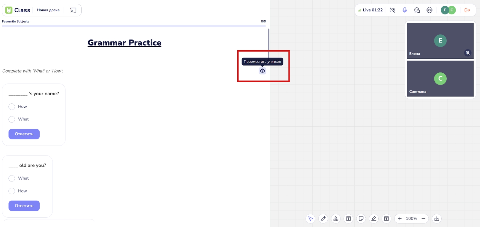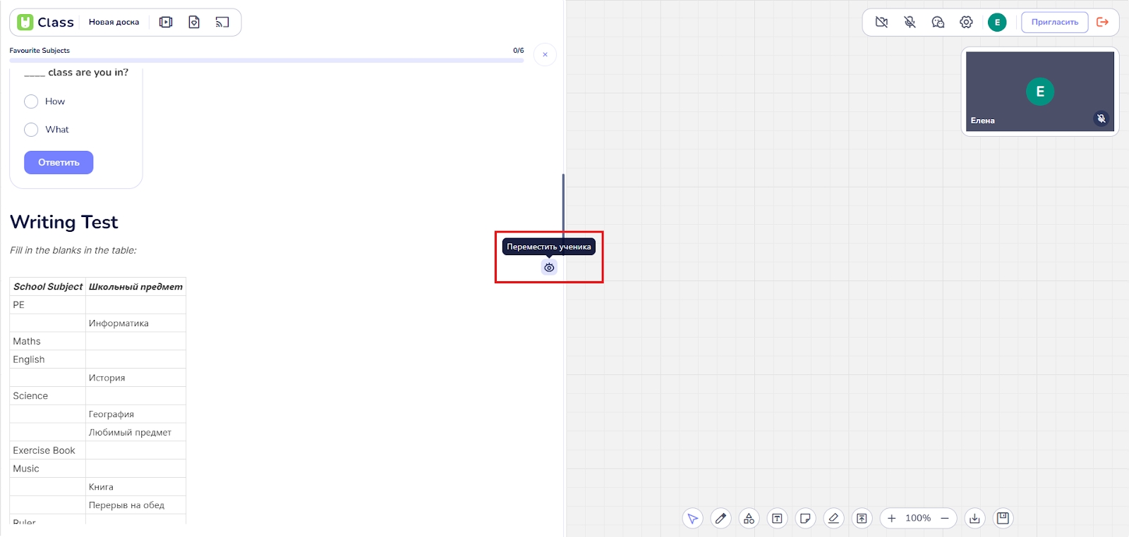 Также в правом верхнем углу у пользователей появляется значок "Глаз", который позволяет одному пользователю переместить другого к выбранному месту в пособии, нажав на этот значок.
