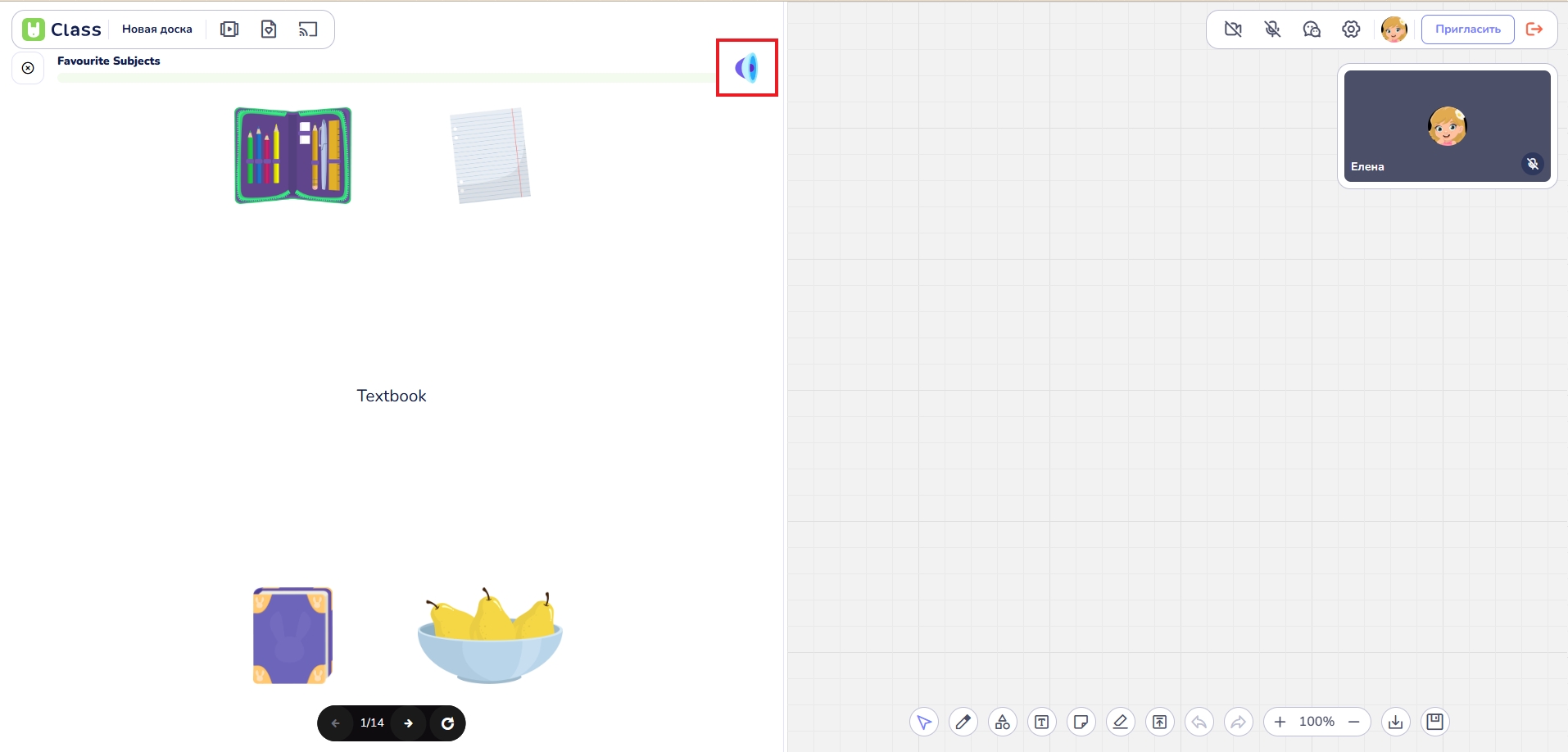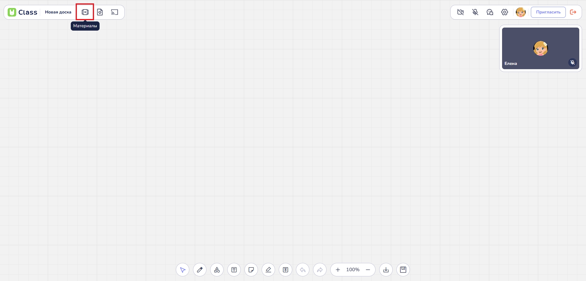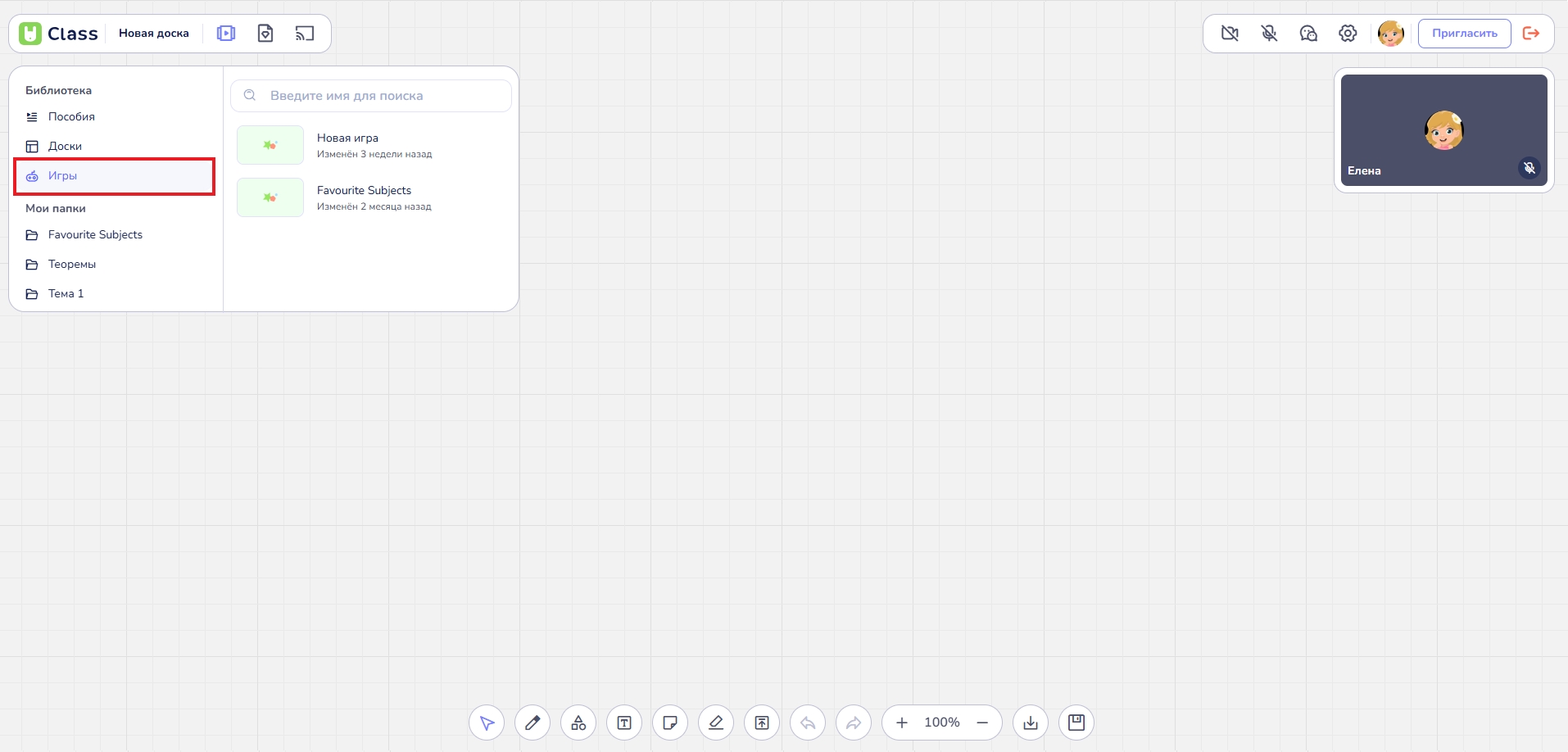В левой части диалогового окна представлена Библиотека материалов. Здесь преподаватель может выбрать, какие материалы загрузить на доску. Это могут быть доски, пособия или игры.
