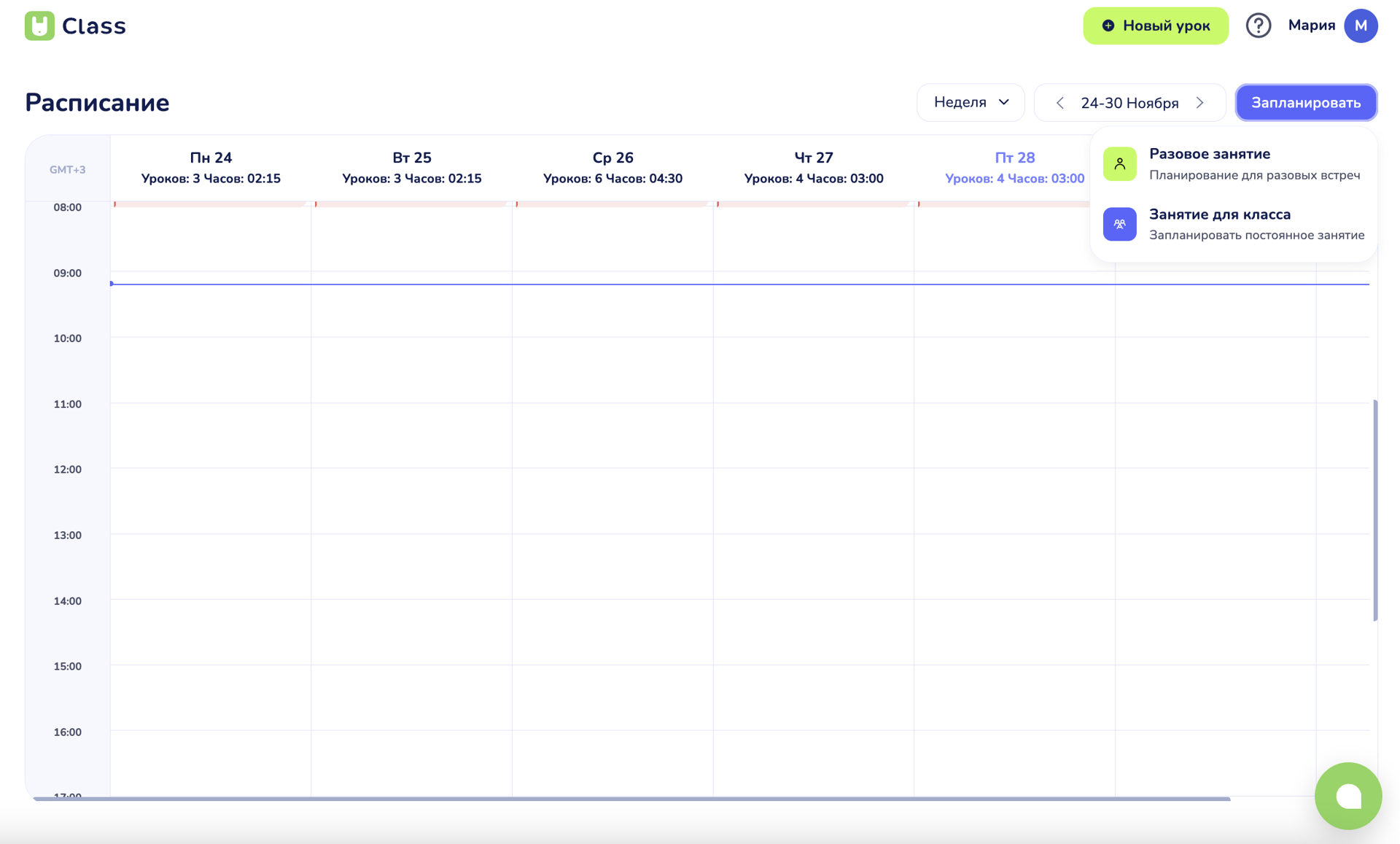 Нажмите «Запланировать», чтобы добавить новое занятие.